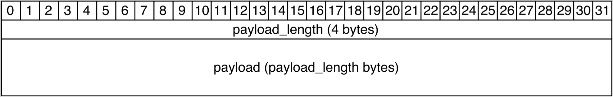 Our protocol is pretty simple. Each message has a specific format as shown in the following figure. The first four bytes are used to define the size of the payload (in bytes). The payload size is defined as a Java primitive int value (32-bit signed two's complement integer, which has a minimum value of -2^31 and a maximum value of 2^31-1. Negative values do not make sense and are not used.). The payload must be encoded using the UTF-8 charset. When a receiver detects a new packet, it knows the length of a message and can be sure to read the required number of bytes before delivering them.