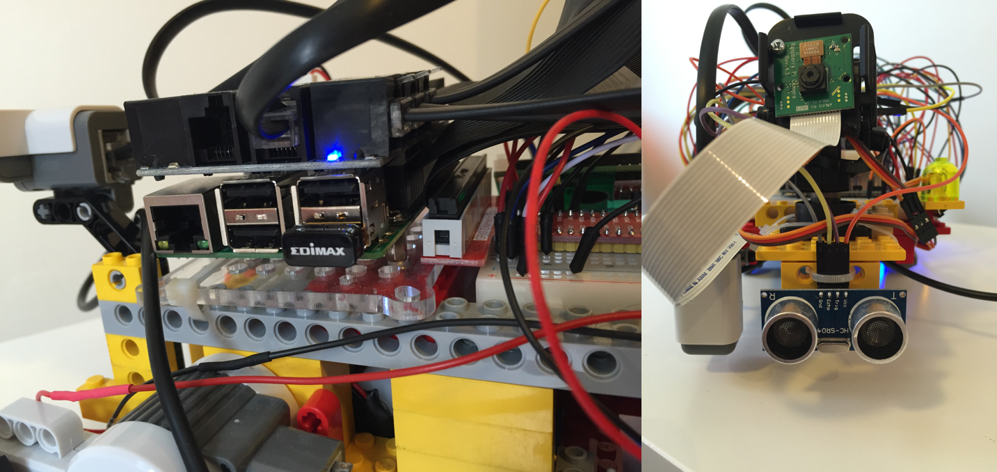 The robot is composed of two floors: the first one is used to hold batteries (a power bank for the Raspberry Pi, a 6x1.5V battery holder for the BrickPi and a 4x1.5V battery holder for the servomotors controlling the camera support) and the second one is used for the breadboards, the Raspberry Pi, the BrickPi, etc.